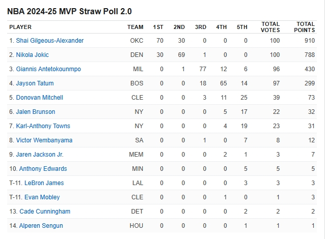 02月15日讯 在全明星间歇期到来之后,ESPN组织了100位记者、媒体人进行了赛季第二次MVP模拟投票,亚历山大获得了70张第一选票,高居榜首,约基奇拿到了30张第一选票,两人包揽了所有的第一选票;字母哥票数总分排名第三,第四是塔图姆,文班亚马位居第七,詹姆斯和埃文-莫布里并列第11。