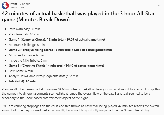 网友吐槽全明星:3小时只有42分钟在打球 甚至广告都有80分钟