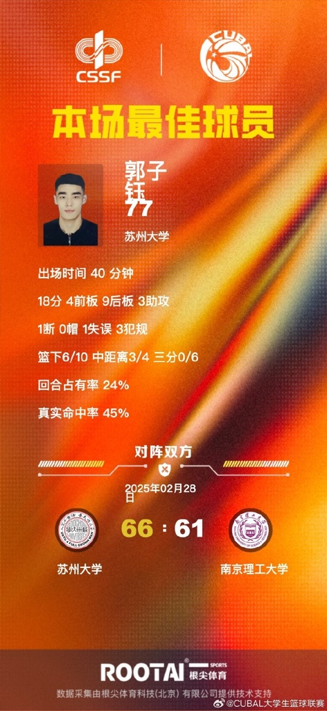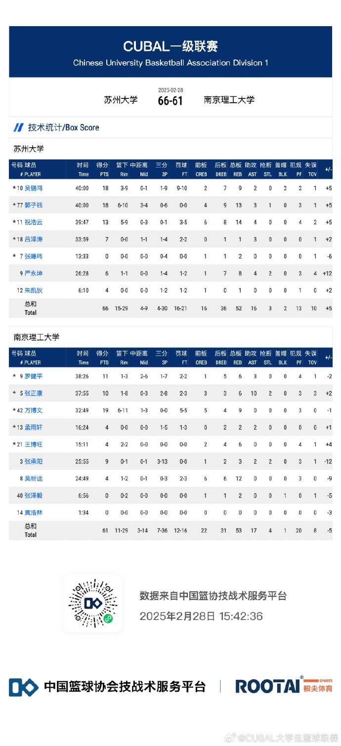 苏州大学:郭子钰18分13板3助,吴锡鸿18分9板2助,祝浩云13分14板4助2帽,严永坤6分8板4助2断,吕泽涛7分3助