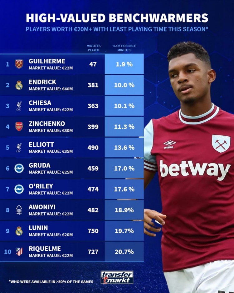 2月18日讯 德国转会市场盘点了2000万欧元以上身价球员的出场时间最少排行,西汉姆的吉列尔梅排名第一,仅出场47分钟。